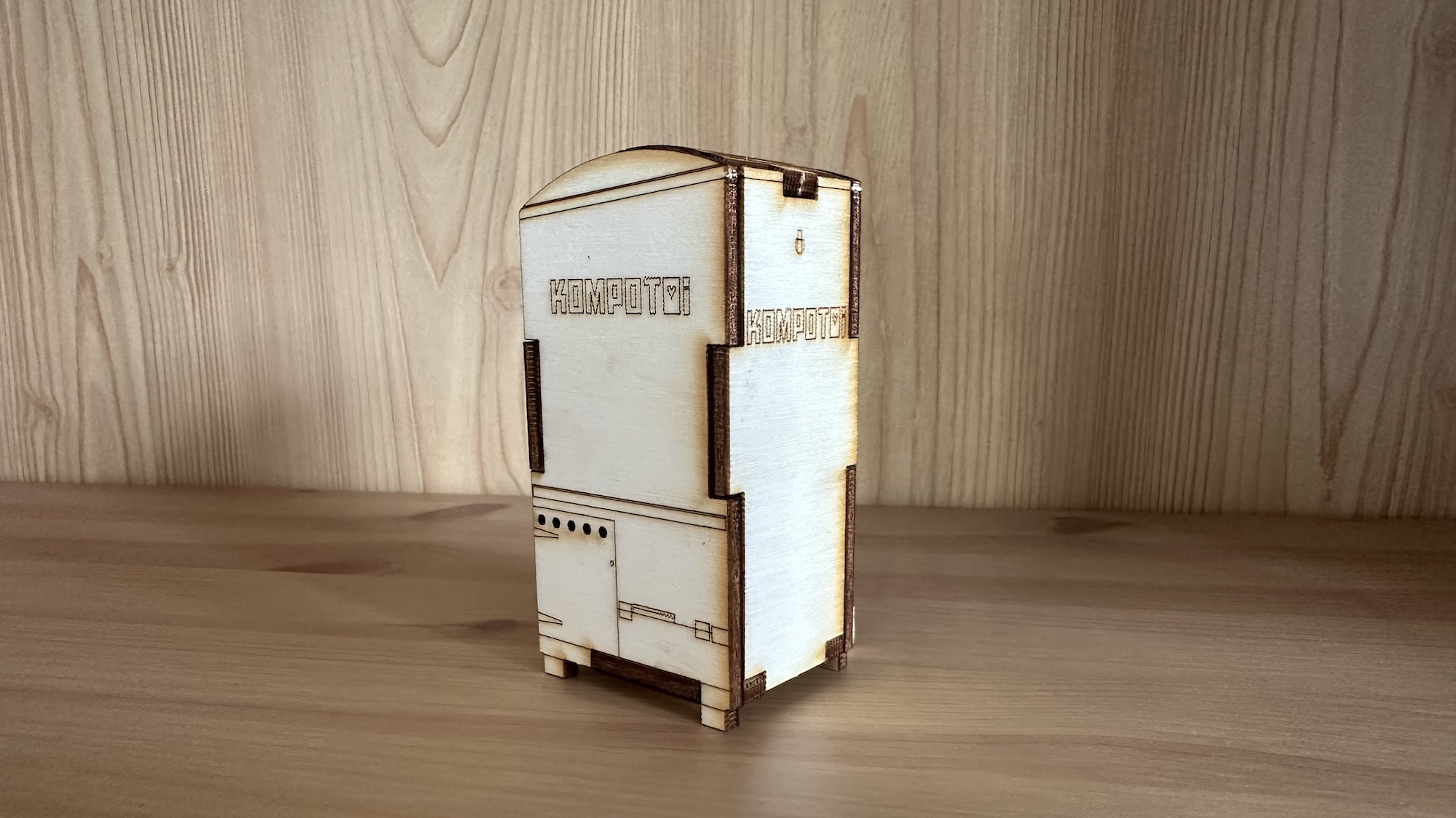 👉 Hier gibt es das Miniatur-Kompotoi in etwas grösserer Ausführung (Höhe ca. 250 mm, mit Innenleben und funktionierender Tür).